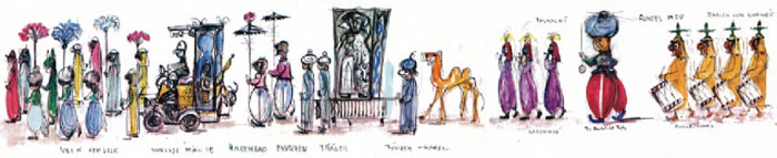 Die Produktion des Zuges ist abhängig vom Sujet. Je nach dem werden Kostüme und Larven von jedem Einzelnen hergestellt oder einheitlich durch Schneider und Larvenmacher.